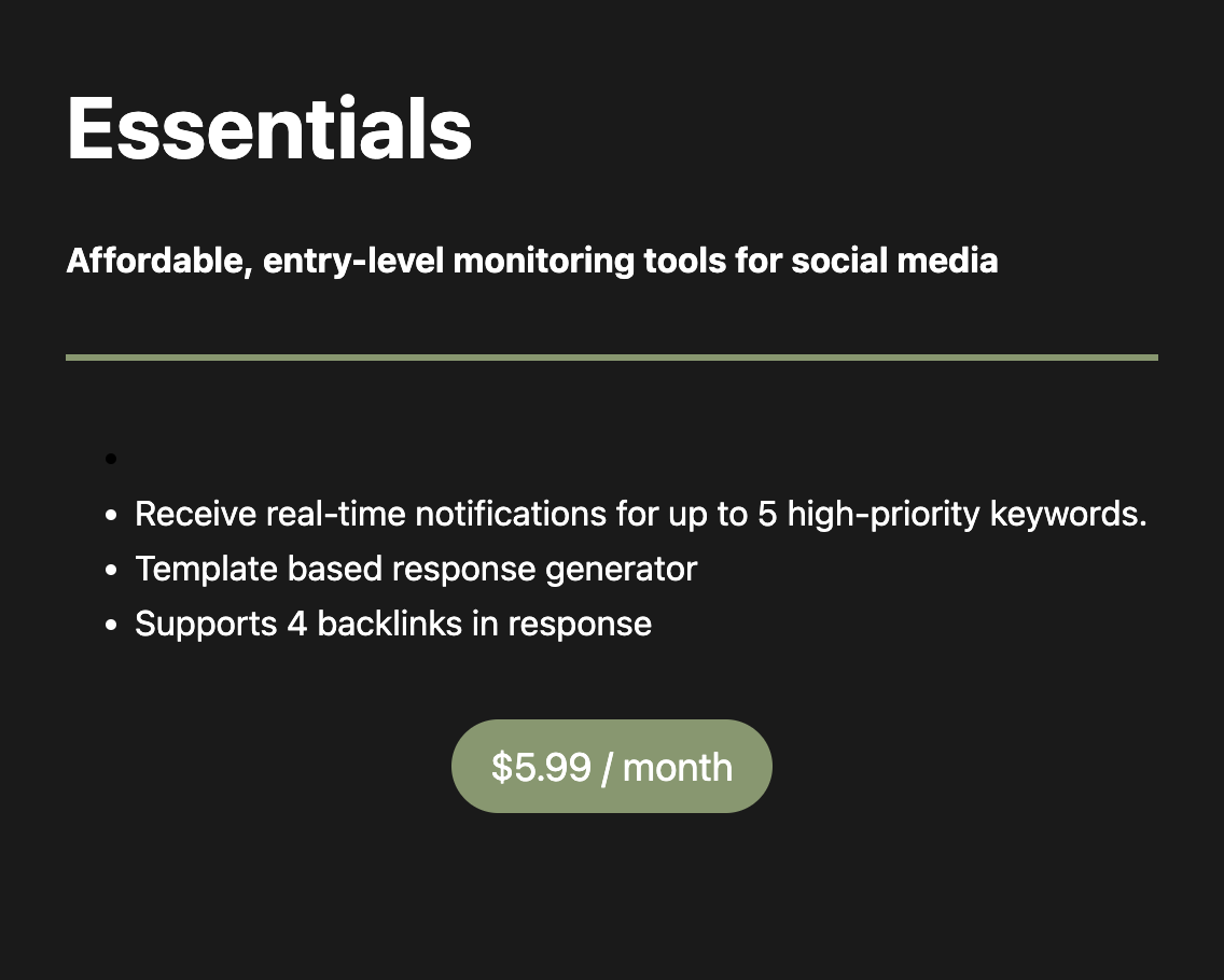 The BuzzStrike Essentials Plan offers an affordable entry-level toolkit tailored for Virtual Assistants, Freelance Chatters, and Small Businesses in budget-conscious regions. Designed to streamline social media monitoring, this plan includes core features like keyword alerts and basic response tracking, helping users stay on top of important conversations without added complexity or cost.